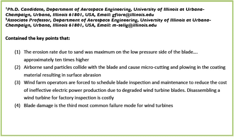 “Simulation of Damage for Wind Turbine Blades Due to Airborne Particles” Volume 39, NO 4 2015 pages 399-418 , written by Giovanni Fiore1 and Michael S. Selig2*
